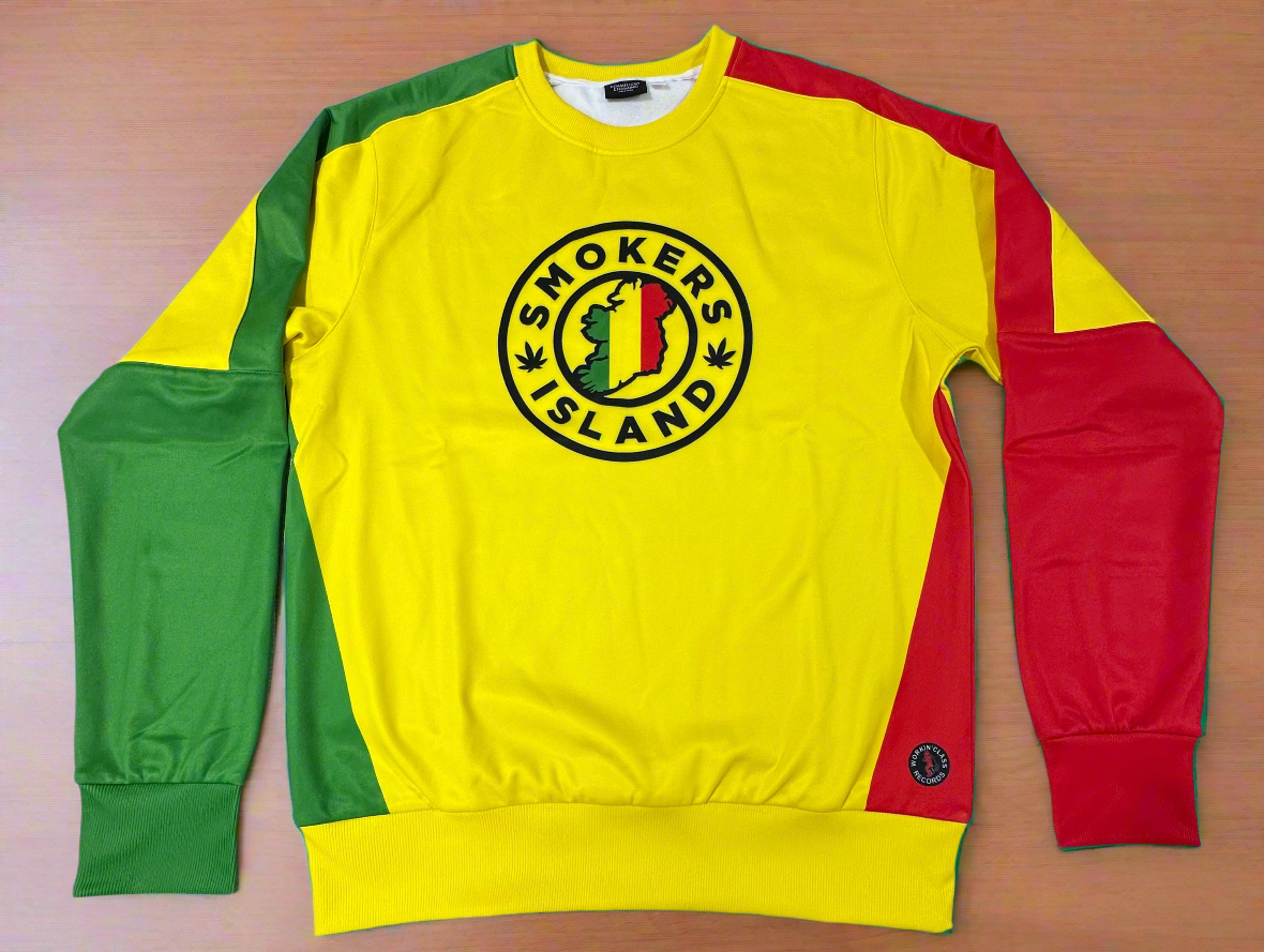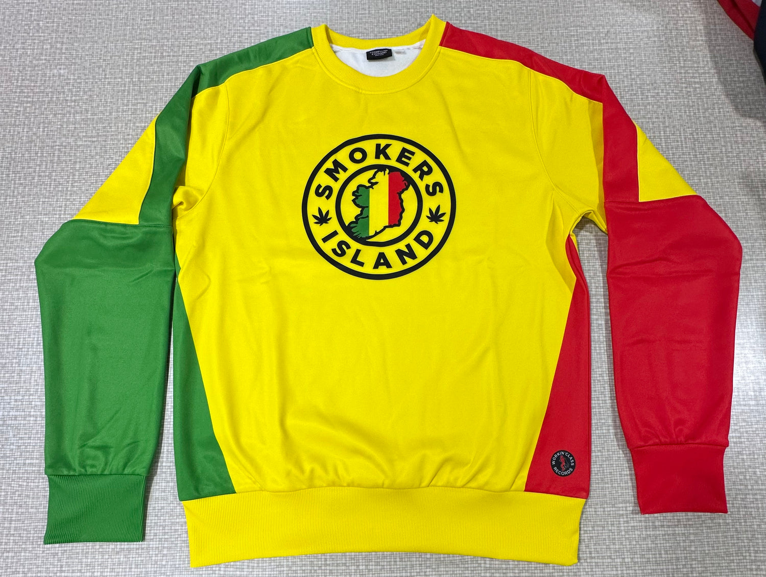 Super comfortable Smokers Island Sweater in Green, Yellow and Red. Made exclusively for Cosmellow Clothing. 100% Polyester